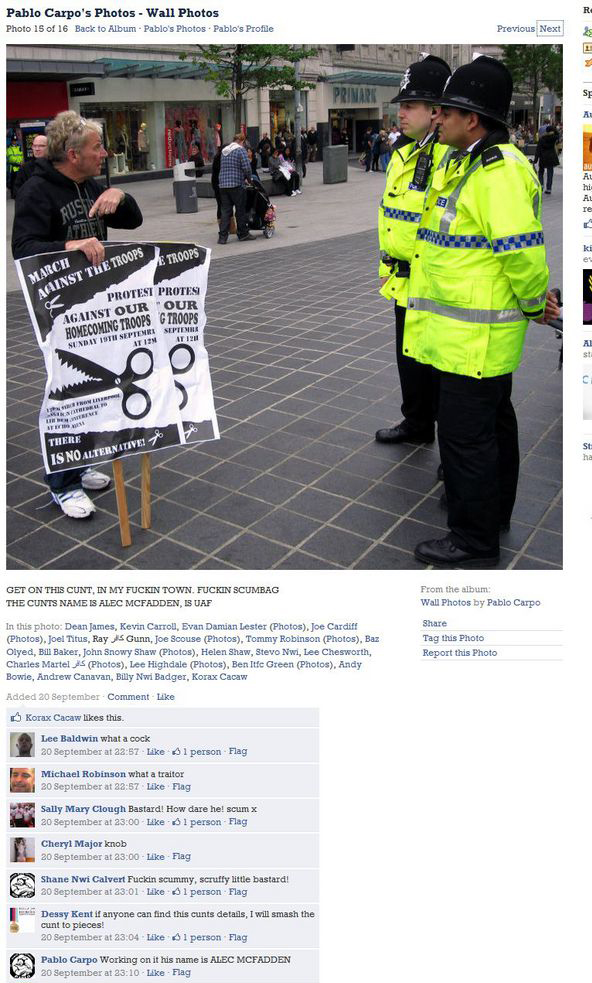 2nd photo - the photoshopped fake anti-troops banner and EDL names screen-capped from Pablo Carpo's Facebook page