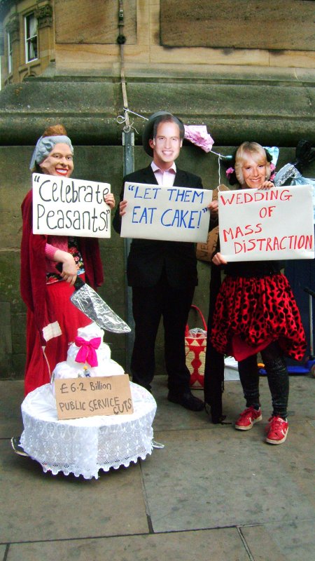 These ones left us in no doubt about the privilege of the real royals and the contempt they have for ordinary people, as they held signs up saying 'Celebrate, peasants' and 'Let them eat cake'. David Cameron turned up brandishing scissors to make "cuts" with, and boasted that it was a wedding of mass distraction from the slashing of jobs, benefits, and services (which run to hundreds of millions in Newcastle alone).
