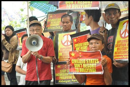 Akbayan Representative Walden Bello who led the protest denounced the provocative acts of the Chinese government, which he described as blatant bullying.