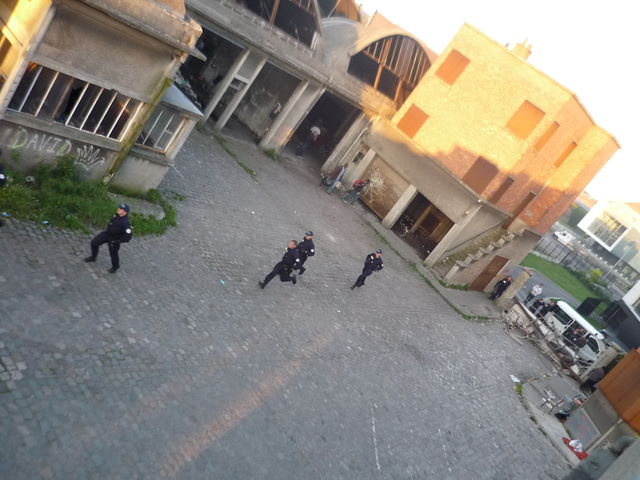 As a result of being evicted from Africa House, the shelter of around 100 people, many people moved to ‘Global House’ a big empty factory 20 minutes walk away, only to be forced out on the street again that same evening. Private security ‘LSG’ surrounded the factory with dogs, accompanied on and off by Police Nationale and PAF, letting people leave but not re-enter. During the day most people went to Distribution to get food and water but found when they returned afterwards they could not get back into the squat or get their belongings. The security refused to allow food and drink inside, but activists managed to smuggle bits in. Later in the evening at around 9.30pm the private security finally evicted everyone. Those left inside managed to take everyone’s things with them but many people’s bags, clothes, blankets are not yet reunited with their owners.