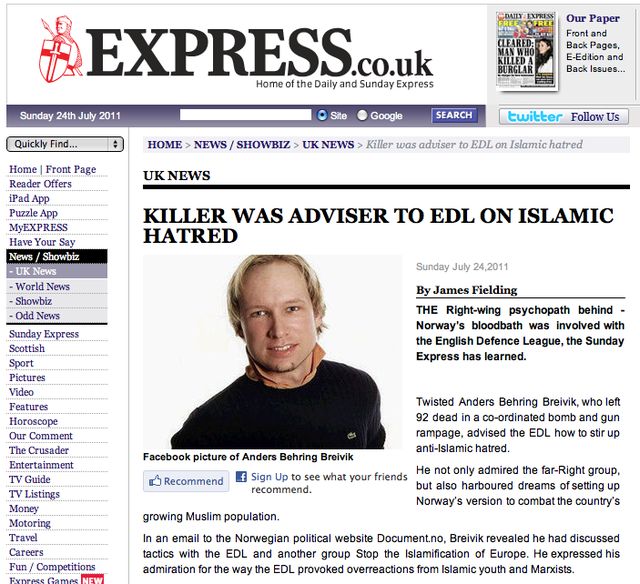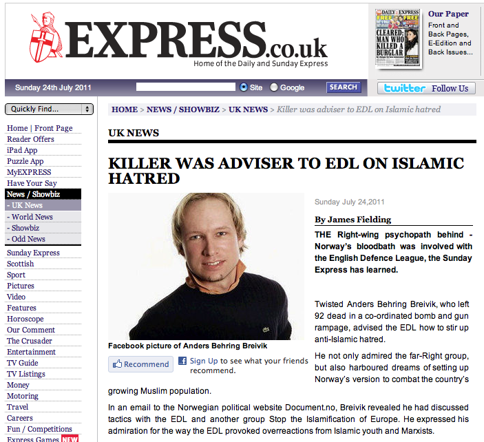 Daily Express admit Anders Behring Breivik's linked to EDL