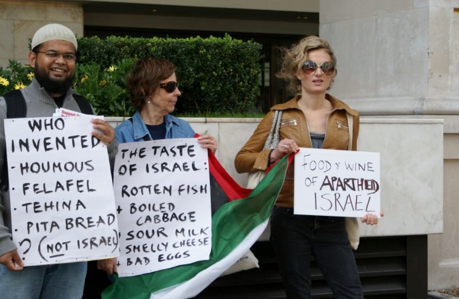 activists, reading "Food and wine of apartheid Israel" and "The bitter taste of