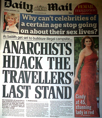 Further evidence of this strategy is provided by recent media coverage of the Dale Farm campaign. The Daily Mail ran a front page feature trumpeting how the campaign had (in their opinion) been "Hi-Jacked by Anarchists". The text of the article conceded the alleged 1,000 activists were in fact "anarchists and student protestors" - in other words that alot of the protestors weren't anarchists after all, but then the Mail tried to prove their headline claim with photos (see web link) that showed a whopping half-dozen activists, identified as being "anarchist" on grounds no more convincing that they use boiler suits to help conceal their identities*. Now, it may be that some of these activists are anarchists, but on the strength of the evidence printed in The Daily Mail there are less than 10 of them, including at least one Daily Mail infiltrator, and the Daily Mail infiltrator quoted all sorts of statements allegedly made by these people, which, for the simple reason of being attributed to un-named individuals, can never be verified. Meanwhile, when a Dale Farm campaigner interviewed by BBC News 24 anchor Simon McCoy pointed out the evicting bailiffs have a reputation for serious criminal violence, the interview was cut-dead mid-sentence, on grounds that her claims could not be verified... how convenient! Still the damage is done however, as millions of members of the public now associate the Dale Farm campaign with... you guessed it... dangerous extremists!