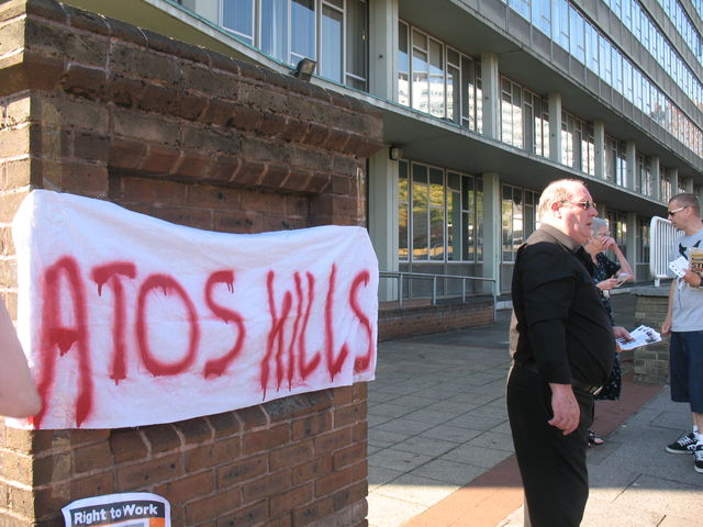 In Birmingham, DPAC, Birmingham Against the Cuts, Right to Work and Enable joined together for a lunchtime demonstration outside the building that ATOS use for the Work Capability Assessments (WCAs).