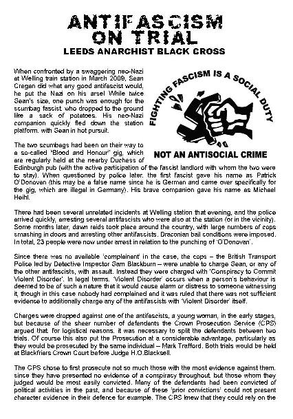 1) Leeds ABC are not, as you say, “supporting people accused of conspiring to commit violence”. Both trials are over, there are no more “accused”. A summary of the case is given in the PDF leaflet above.