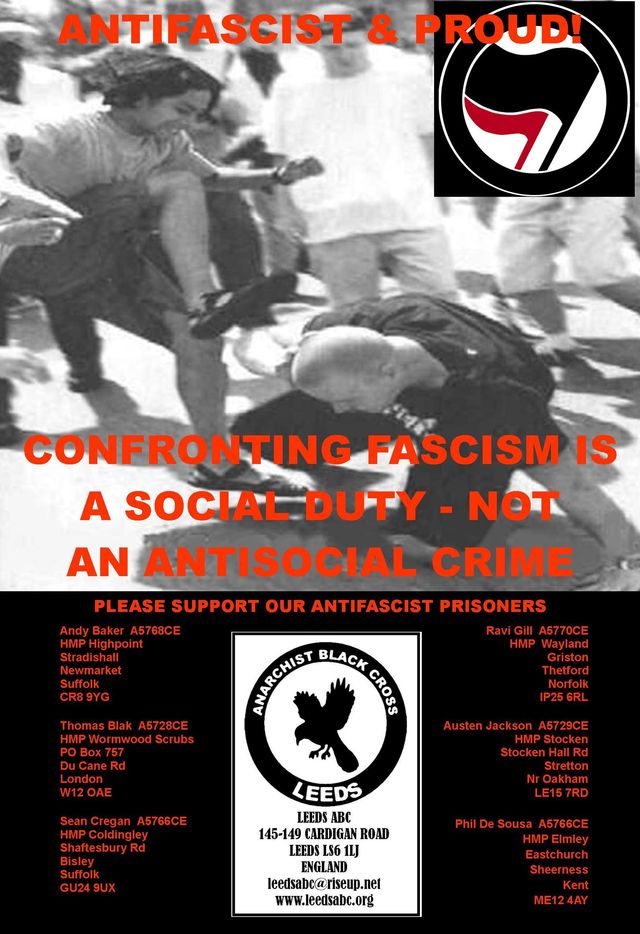 The prisoners are either guilty of conspiring to commit violent disorder and should be asking for support on these grounds or are not guilty and have been fitted up and support should be given on these grounds. Leaflets that show peoples heads been kicked in and then ask for support of people who did not commit a conspiracy can only drive away support and probably help the state. I presume that Leeds ABC do not mean to do the states work for them and provide evidence for the police in future trials so what do they really think is gained by this graphic?