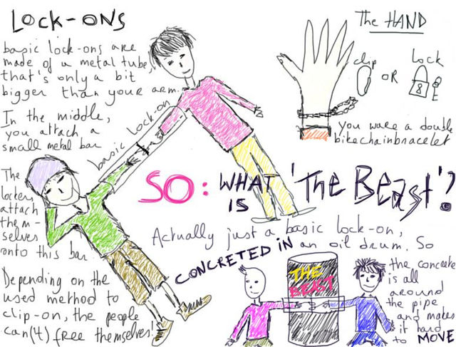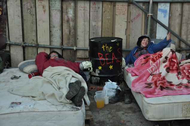 I was locked into the drum with my friend Emma who also had her neck chained to the main gate, something which seemed to scare quite a lot of people, including many of the travellers at first. Most importantly, however, it also provoked a strong reaction on the part of the bailiffs. It was in fact a last minute, pragmatic solution to the problem of how to stop the bailiffs from just pulling open the gate.