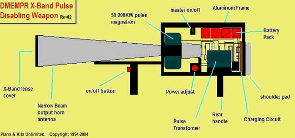 3. There's not enough power generation or storage capacity to get more than a few inches from the end of the horns which would be silly as it's on the end of an extendable rig. You have to knock out SERIOUS amounts of watts as the effective power decreases very quickly the further you go out of the emitter. I know people post microwave weapons on youtube but they are pointlessly underpowered and would do sod all at even 2m range (despite what they'd have you think).