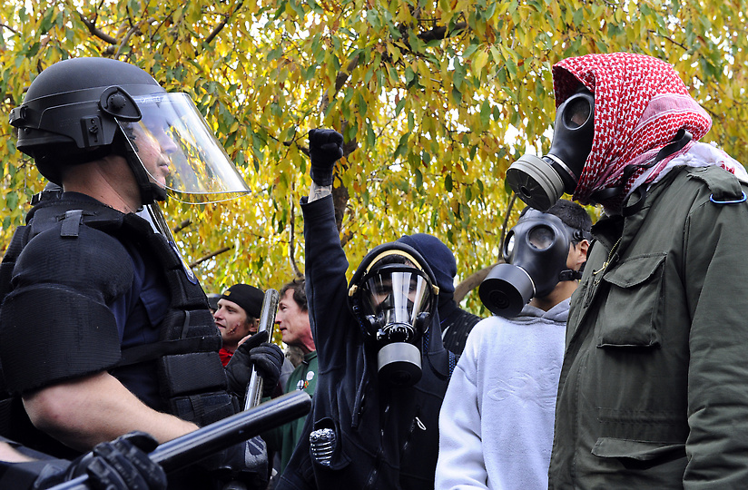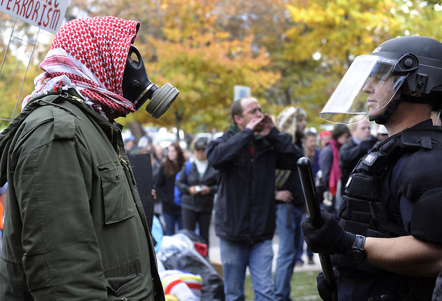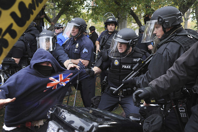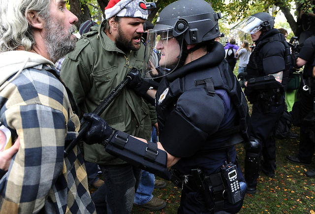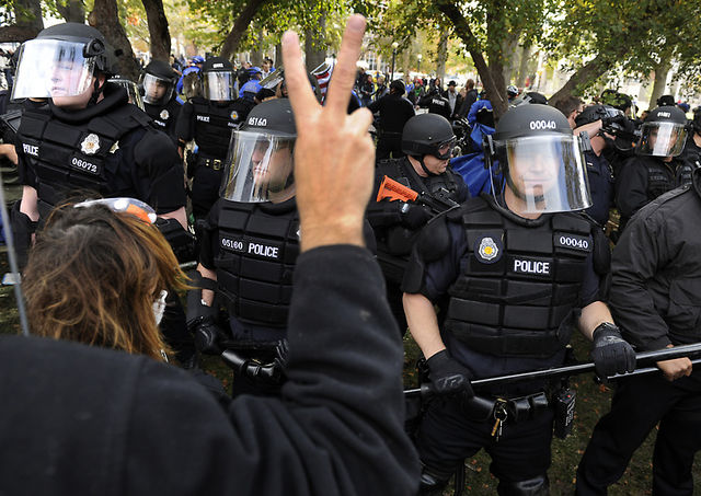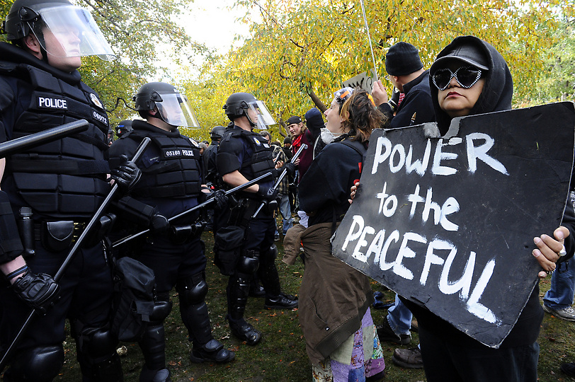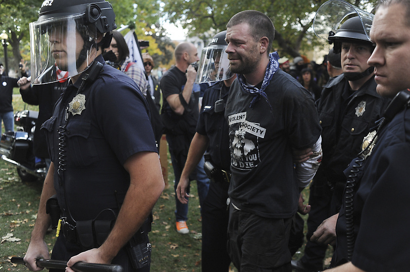 http://photos.denverpost.com/mediacenter/2011/10/occupy-denver-protesters-face-off-with-police-saturday-october-29-2011/23403/ Police beat #OccupyDenver protesters earlier today