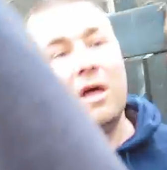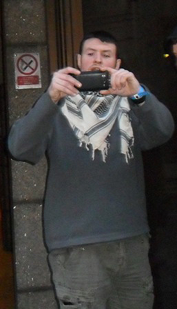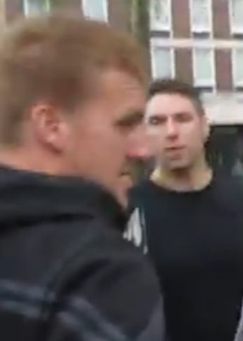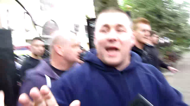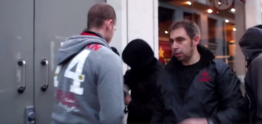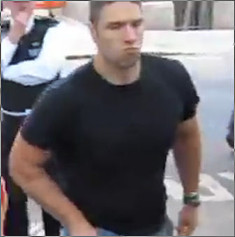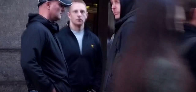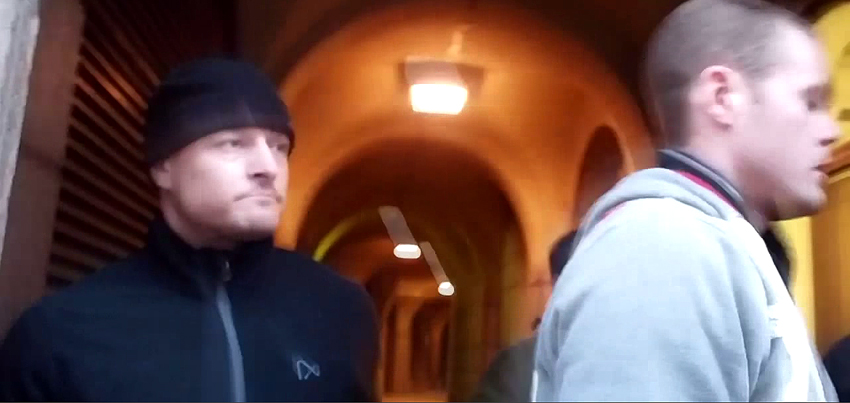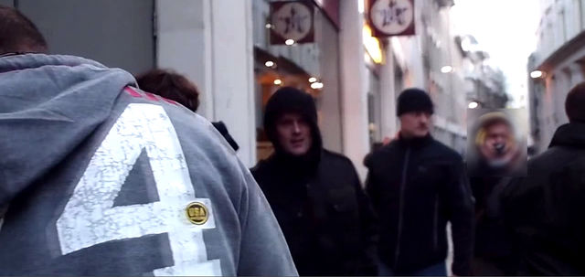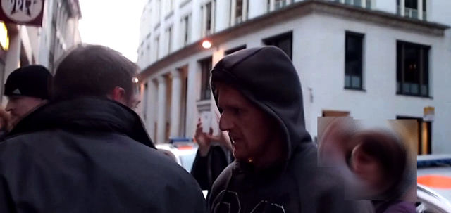If you freeze the first video around 1:09 the cop from the 3rd, 4th and 5th photos at the top of this page (black jacket with red embroidered logo) is dragging the protestor by his HAIR, the protestor's also being attacked, from behind, by the cop in the brown jacket (photos 1 and 2 above), by the cop with the black baseball cap with the white rim on it (later photos), and by one other cop I can't make out, while the cop with the blue-ish hoody with "93" on it takes up the rear, then swings round to join red n' black attacking more photographers (1:12). Around 1:14 the cop in the brown jacket is crushing the protestor's SKULL against the tarmac. The black-hoody with "Lonsdale" on it and brown trousers seems content to mostly just look stupid (1:21).