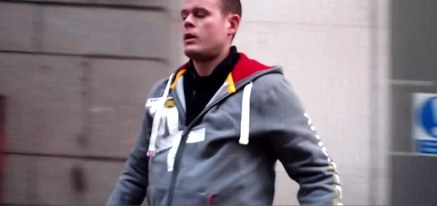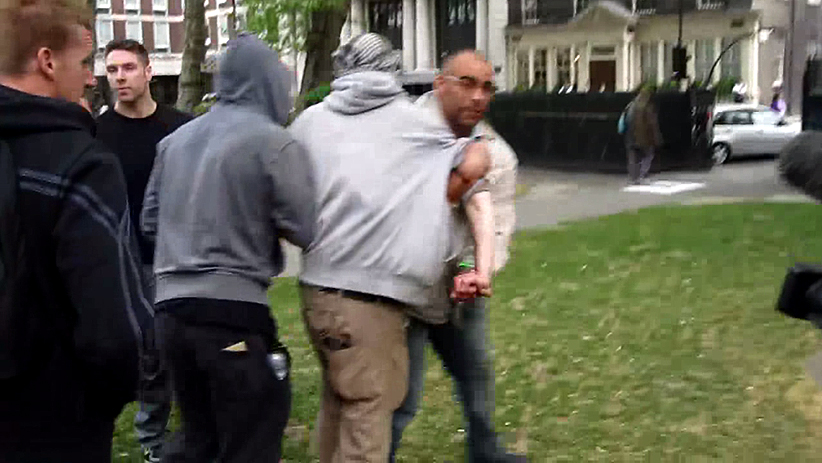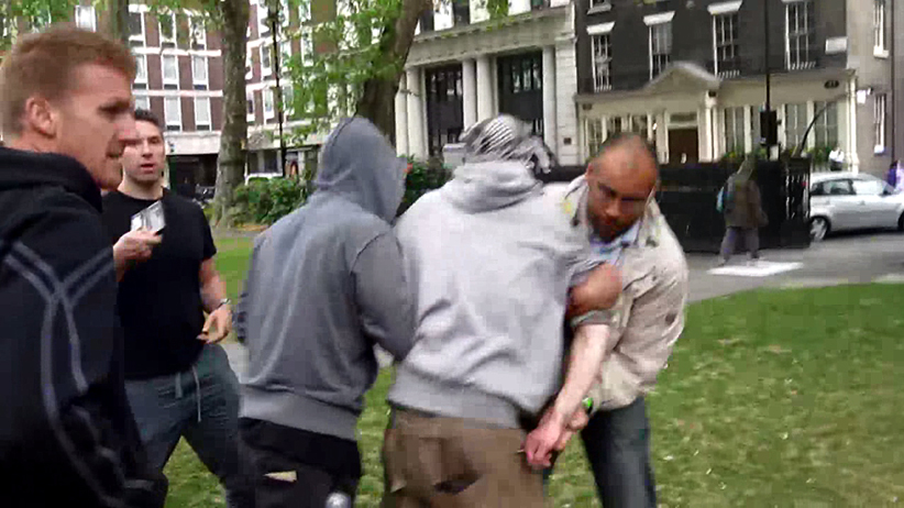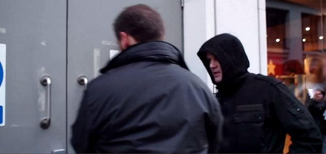 Brown jacket and 3 more thugs struggle to floor 1 skinny lad...