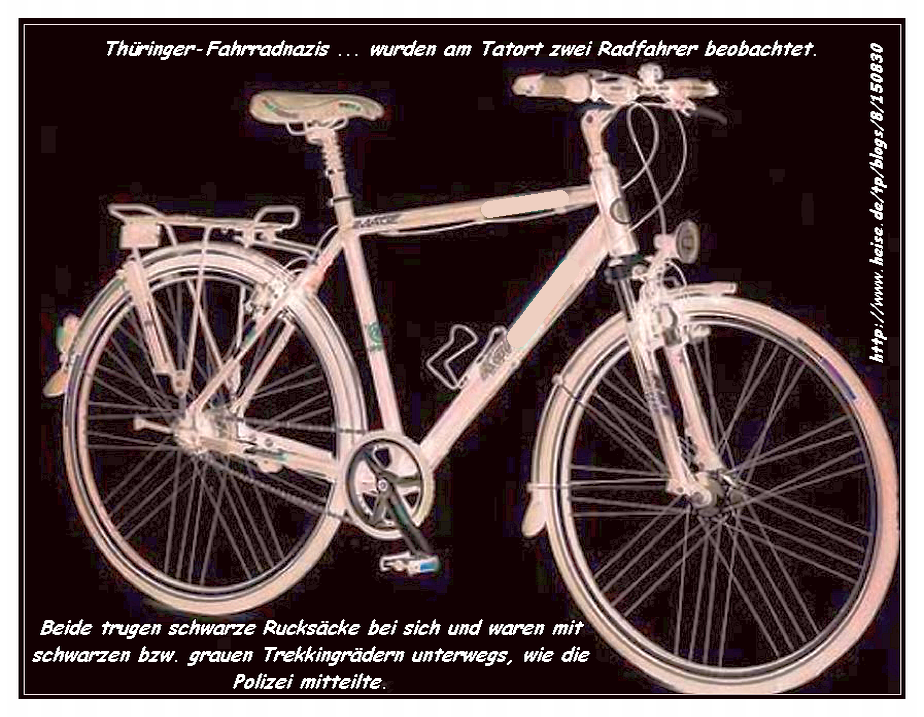 Picture: Thüringer-Fahrradnazis ... wurden am Tatort zwei Radfahrer beobachtet. Beide trugen schwarze Rucksäcke bei sich und waren mit schwarzen bzw. grauen Trekkingrädern unterwegs, wie die Polizei mitteilte. .....  http://www.heise.de/tp/blogs/8/150830