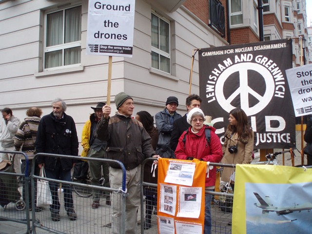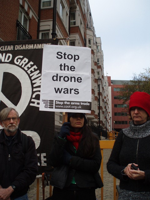 “Drones” are remotely piloted aircraft or “unmanned aerial vehicles” (UAV). While UAV have a number of useful civilian purposes, they are increasingly used in war and combat situations, for both reconnaissance and combat missions. To protest their growing popularity and “must-have” status with armies around the world, over two dozen campaigners joined the Campaign Against the Arms Trade (CAAT) and Drone Wars UK for a demonstration on day one of the “Unmanned Aircraft Systems” two-day conference outside a hotel at an out-of-the-way location in Kensington, London.
