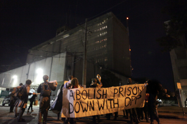 A group of about two dozen protesters marched to the fences of OPP at Broad & Tulane November 9th banging pots and pans and shouting chants. The prisoners could be seen inside the prison from stories above waving their arms and pieces of clothing. The event was described as a noise making act to let the prisoners know there are others outside that stand in solidarity with them.