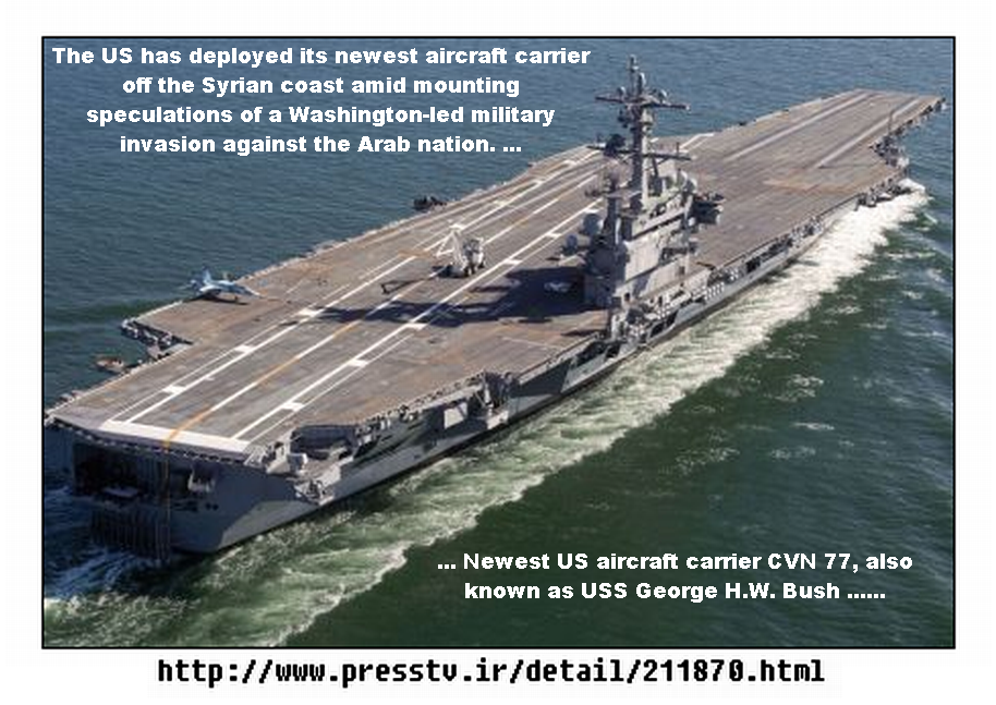 http://www.youtube.com/watch?v=Ei_2bk0JQdo Picture: The US has deployed its newest aircraft carrier off the Syrian coast amid mounting speculations of a Washington-led military invasion against the Arab nation. ... Newest US aircraft carrier CVN 77, also known as USS George H.W. Bush ......