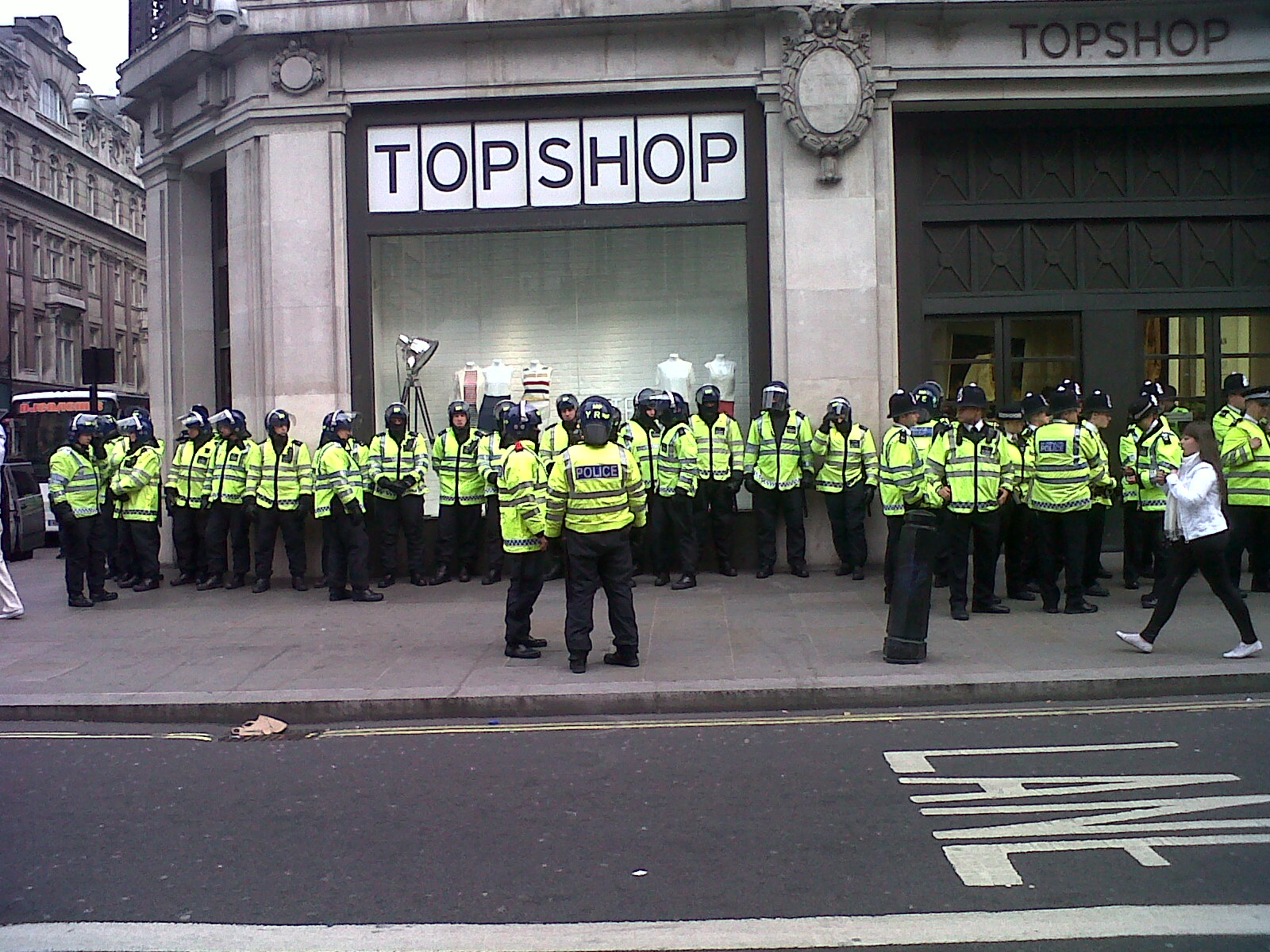 For chanting “pay your tax”, two snarling beefcake thugs hired by Topshop bent my arms behind my back, shoved me in front of two coppers, who then frog marched me out to the back of the store, and onto the police station, where I remained for seven hours.
