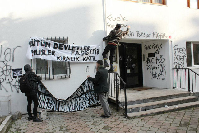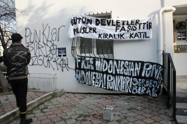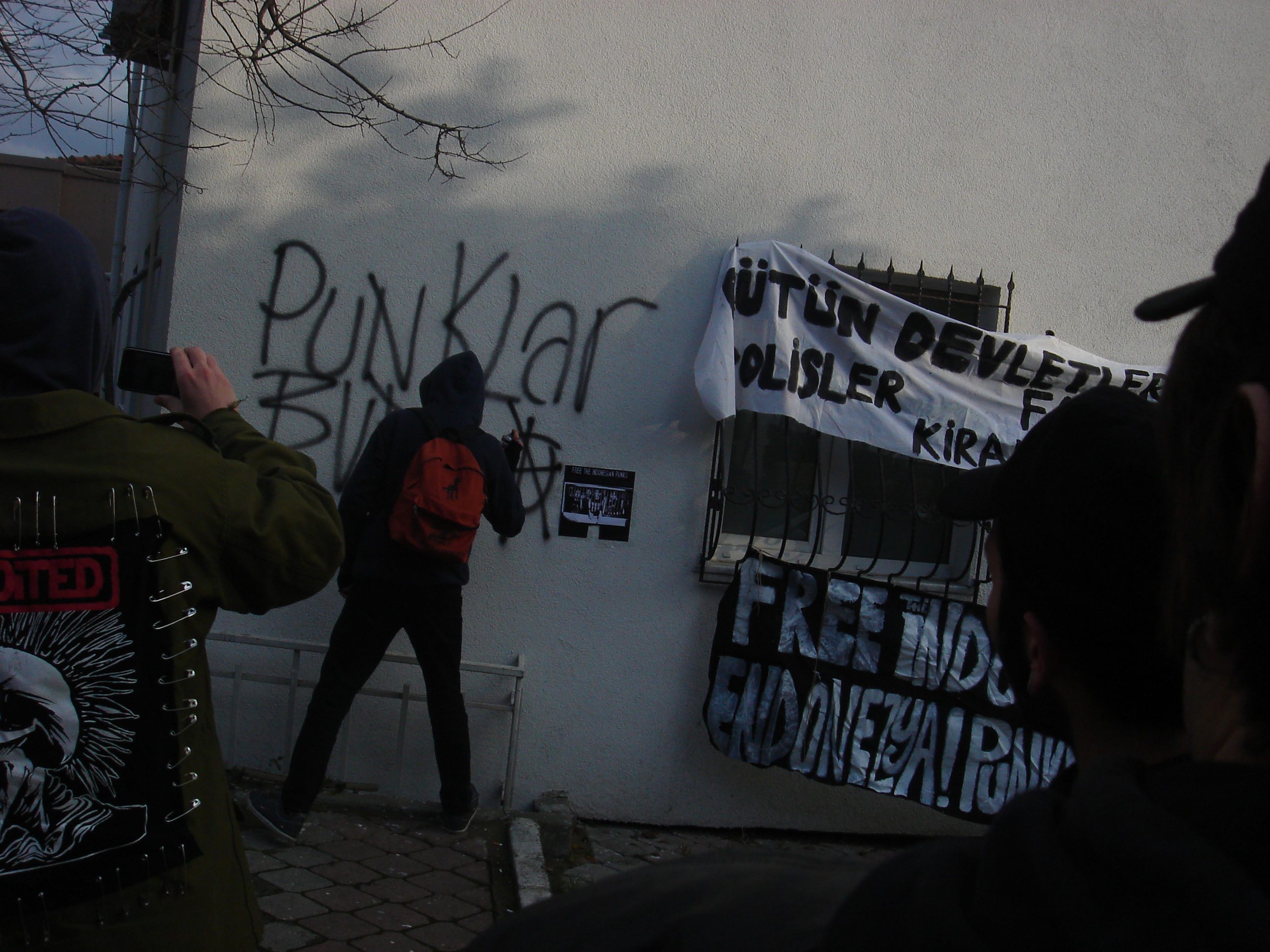 While playing punkrock music with a portable sound system, those 30 activists spray-painted the consulate with slogans saying: ”Dinleriyik Yoket (Abolish all Religions)“, “Free Aceh Punx”, “ACAB”, “Punklar burda (The Punks are Here)” and “Özgur Kal (Stay Free)”.