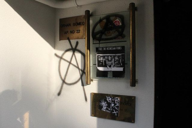 On the 25th of December at 3:00 in the afternoon, as a sign of solidarity with the “Aceh 64”and as a reaction to this ultra-repressive measure of the Indonesian state, 30 punks and anarchist activists attacked and defaced the outside walls of the “Indonesian Consulate General” located at “Seneryildizi Sokak, No. 22/11 Etiler” in Istanbul, Turkey.