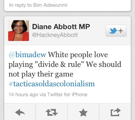 But more than that, by couching her Tweet in purely ethnic terms, Abbott has laid herself open to easy and convenient accusations of racism. If she is forced out of the shadow cabinet, and is replaced by another bland 'Blue Labour' drone, then many on the right will be pleased. Furthermore, by implicitly playing this up as black vs white, the media papers over the chasmic class divisions in society.