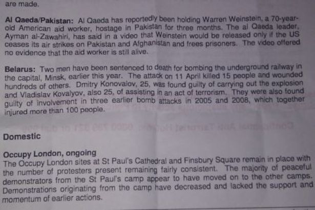 In other words, a regular “Terrorism/Extremism” business community update disseminated by City Police has, on seven separate occasions, not only slandered a group of peaceful protestors camping in freezing weather against corporate greed, but smeared them as somehow being connected to proscribed and violent organisations such as the Revolutionary Armed Forces of Colombia (FARC) and Al-Qai’da.