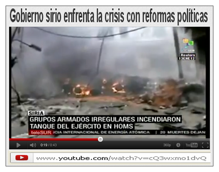 http://urs1798.wordpress.com/2012/01/13/wie-hoch-ist-die-zahl-der-getoteten-soldaten-und-polizisten-in-syrien-und-die-der-zivilen-opfer/ Picture: SYRIEN - Terroristen zünden Tank an ... „Weiterhin Übergriffe durch bewaffnete Gruppen in Syrien, eine neue Aggression gegen die Armee fand in Homs statt . Die Regierung ihrerseits, entwickelt sich weiter, …“ via TeleSur-Video - Gobierno sirio enfrenta la crisis con reformas políticas -