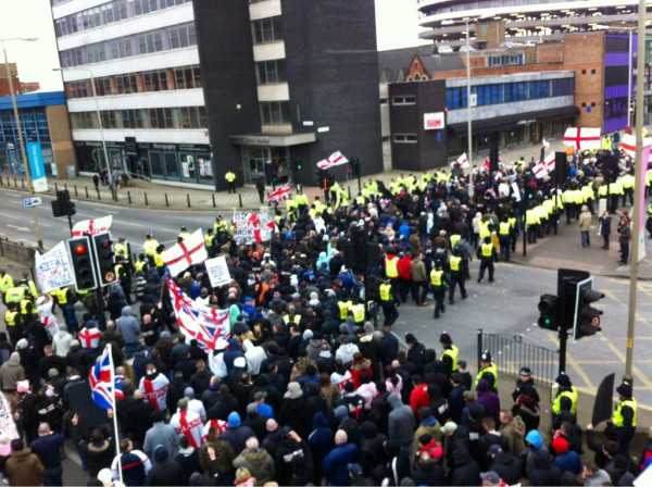 The EDL, meanwhile, threatened to bring ‘thousands’ of drunken fascist hooligans into Leicester. However, some of us knew better, fully aware that the splits and infighting among the EDL with its organisation literally falling apart at the seams would take its toll. The fact that it was generally a bit nippy and the pubs would be shut was also sure to damage the EDL Special Brew Division’s turn out as well. As it happens, the fash did manage to collect about 500 (the Leicester Mercury claims 700) dubious specimens of the ‘master race’ for their march, with the highpoint being the burning of an Argentine flag. Argentina, as everyone knows, is ‘the most muslim country in the world, probably…’ (but we reckon geography is not the EDL’s best subject).