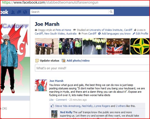 One problem is that Casuals United has ran a number of stories on certain grooming cases and the failure by the police to prosecute a number of paedophile groomers, Marsh is exploiting this in order to peddle his racist views. Casuals united has increased its activity in the run up to the HYDE park demo, and appears to gaining alot of publicity, Marsh has also been increasing his facebook activity in recruiting females into his "Angels division" aswell as verbally abusing anti racists.