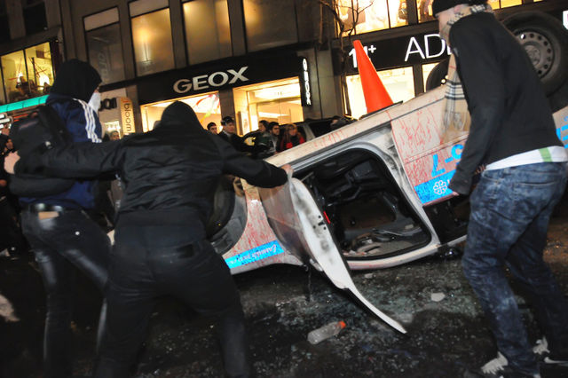 Banks got their windows broken. Fancy stores too. A lot of garbage got pulled into the streets, and pylons, and heavy signs. You know, the usual. But it’s the moments when the pigs backed off cuz they were scared! It’s the moments when you get away with political crimes in totalitarian Canada! It’s the moments when the pig cruiser is flipped over and you’re highfiving strangers becuz you’re happy and they’re happy and this is a moment to cherish. Prole stroll!