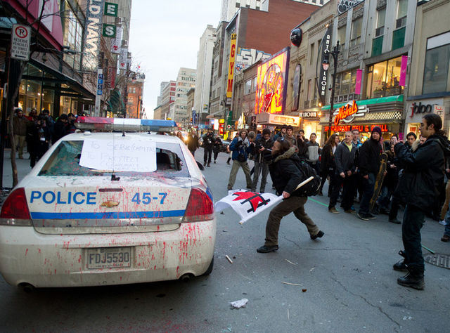 http://www.cbc.ca/news/canada/montreal/story/2012/03/15/anti-police-brut… Some comrades are in jail. Many people, perhaps not yet aware of the fact that we live in a surveillance society, did things that perhaps they should not have done with their faces unconcealed. What happens next is hard to say. Maybe the pacifists who got beaten with police batons when they sat in front of cops will have learned their lesson by now! And maybe anarchists can figure out a way to be half as badass as some of the people who were on the streets tonight.