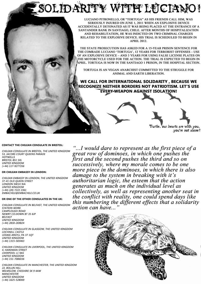 Luciano Pitronello, or “Tortuga” as his friends call him, was seriously injured on June 1, 2011 when an explosive device accidentally detonated as it was being placed at the entrance of a Santander bank in Santiago, Chile. After months of hospitalization and rehabilitation, he was indicted on two criminal charges related to the explosive device. His trial is scheduled to begin in April 2012.