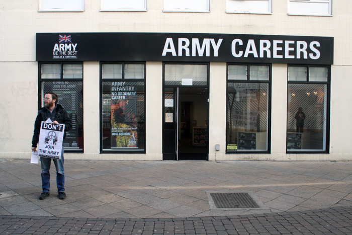 Eight Catholic Workers held a peaceful vigil at Watford Army Recruitment centre on March 20th.