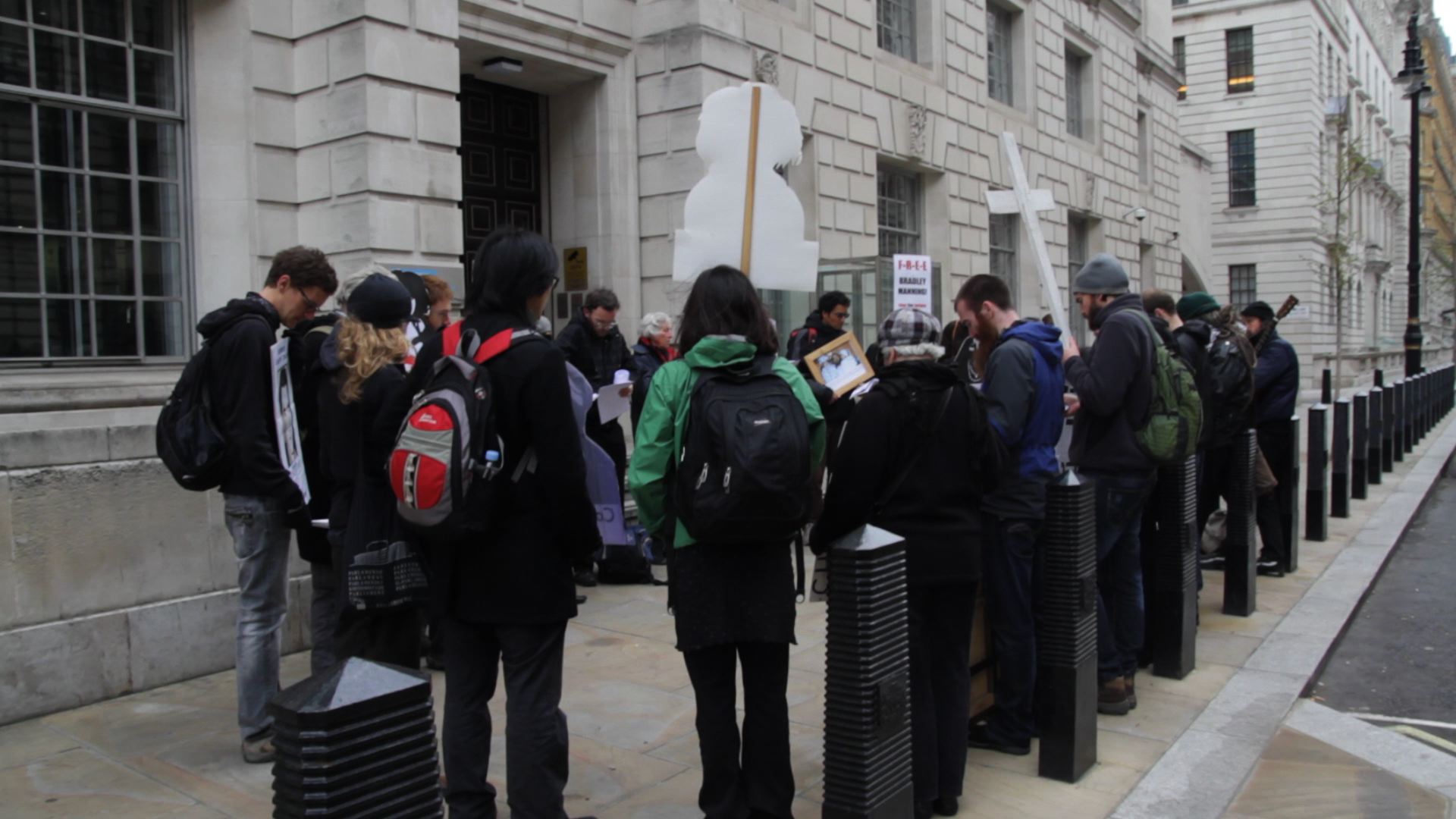 The procession paused for prayer, shared reflection and song outside of Downing St., Ministry of Defence, Dept of Energy, MBDA, BAe Systems, Qinetiq, Defence Export Services Organisation, Rolls Royce, Home Office, MI-5, Arms Export Committee, Treasury Office, Parliament, Foreign Office before returning to Downing St.