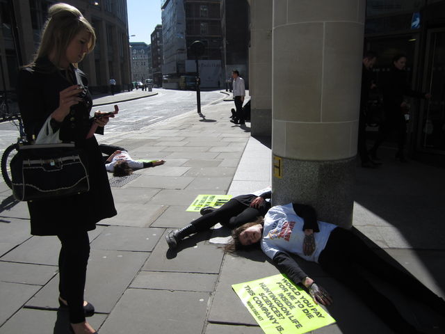 With this area being a busy thoroughfare, there were many City workers walking past the demonstration, many of which stopped to read the placards, look at the activists ‘injuries’ and take photos of the gory scene that had unfolded outside of L&G’s office.
