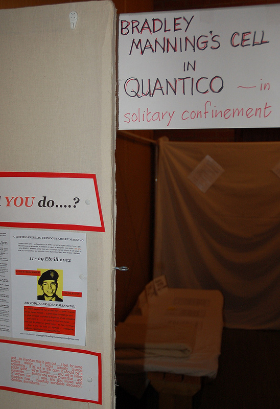 On Friday 13 April, there was an afternoon exhibition about Bradley Manning at the Picton Centre in Haverfordwest, including a mock-up of Bradley Manning’s cell at Quantico where he was tortured with long-term solitary confinement and other cruel and unusual punishments until April 2011. The exhibition was left in situ for the evening when a ‘Transition Town’ supper was taking place at the venue.