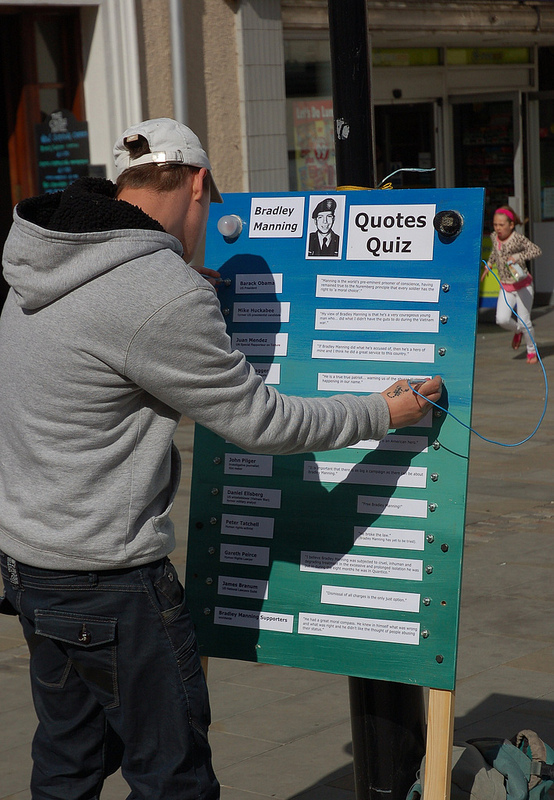 Bradley Manning lived and went to school in Haverfordwest for several years as a teenager. As the play launched at his old school, Tasker Milward, we were on the streets of Haverfordwest with flyers and an interactive quiz speaking to local people about Bradley Manning. We have also been handing out information after every performance of the play.Exhibition and anti-war speakers