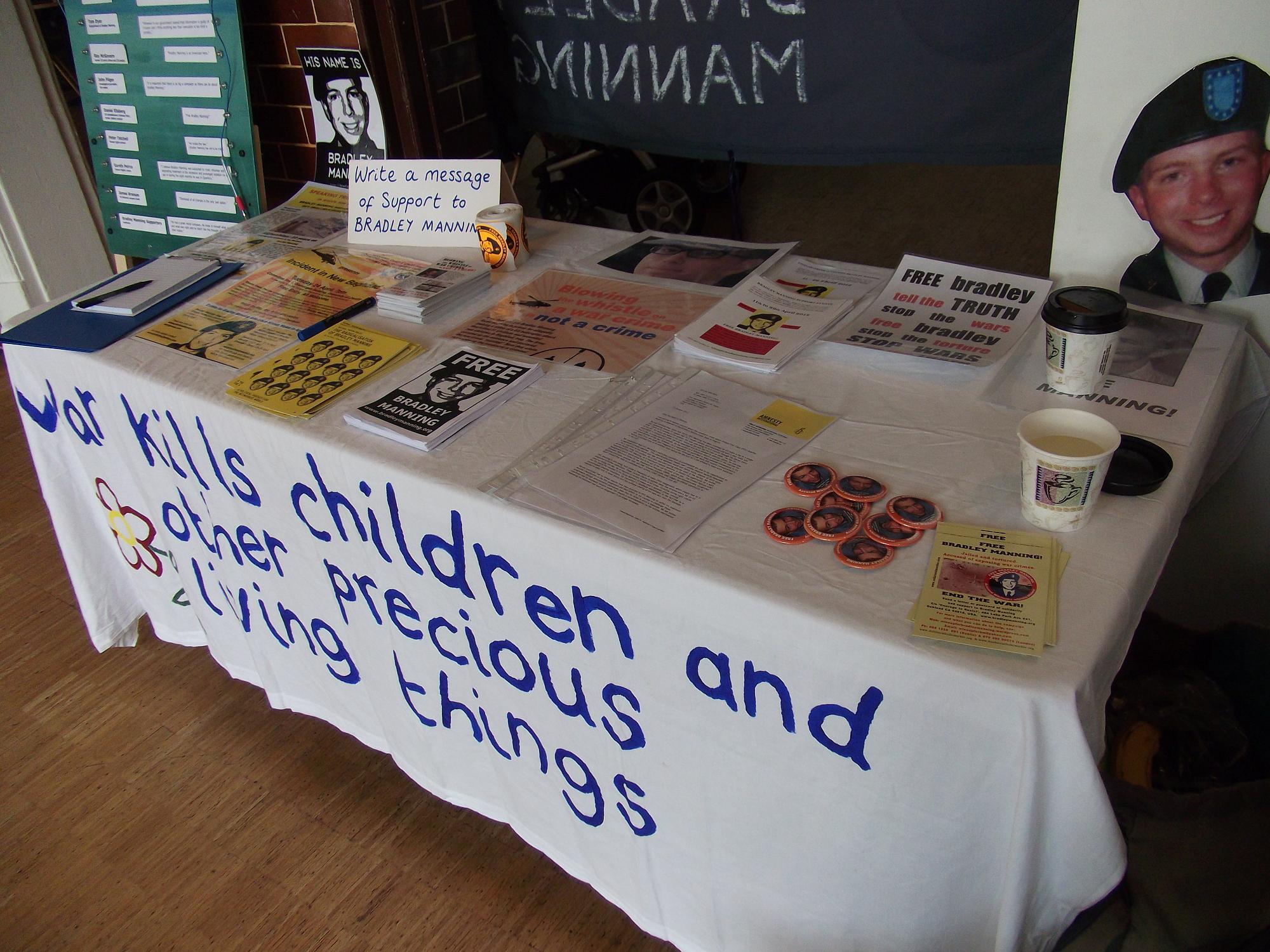 On Saturday, two of us spent the day at the Campaign Against Arms Trade regional meeting where we had a stall for Bradley Manning. People took information, signed up for the WISE Up email list