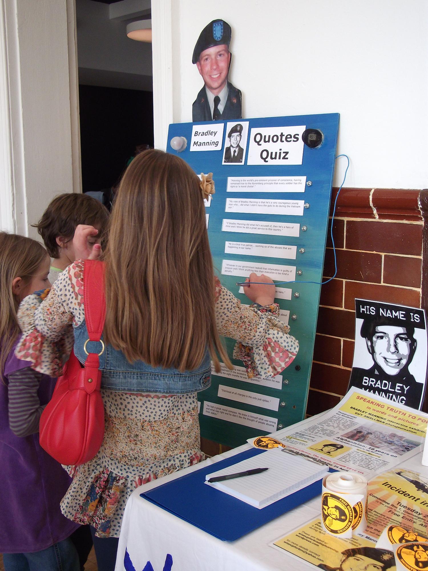 We spent a morning at Chapter Arts in Canton, although their enthusiasm for our presence was apparently a mistake - they thought we were promoting NTW's performances of 'The Radicalisation of Bradley Manning' and weren't nearly so keen on us promoting our solidarity events (which include the sort of arts events we'd have thought Chapter would be happy to promote) alongside the play. It was at the point that we spread our tablecloth decorated with 'War kills children and other precious living things' that they decided we weren't welcome, although they graciously allowed us to stay in the foyer all morning and only occasionally queried when we were leaving. It was still school holidays, so we had a lot of children passing by. People wrote letters of solidarity to Bradley, others tried their hand at the quiz, took flyers and stopped to talk.