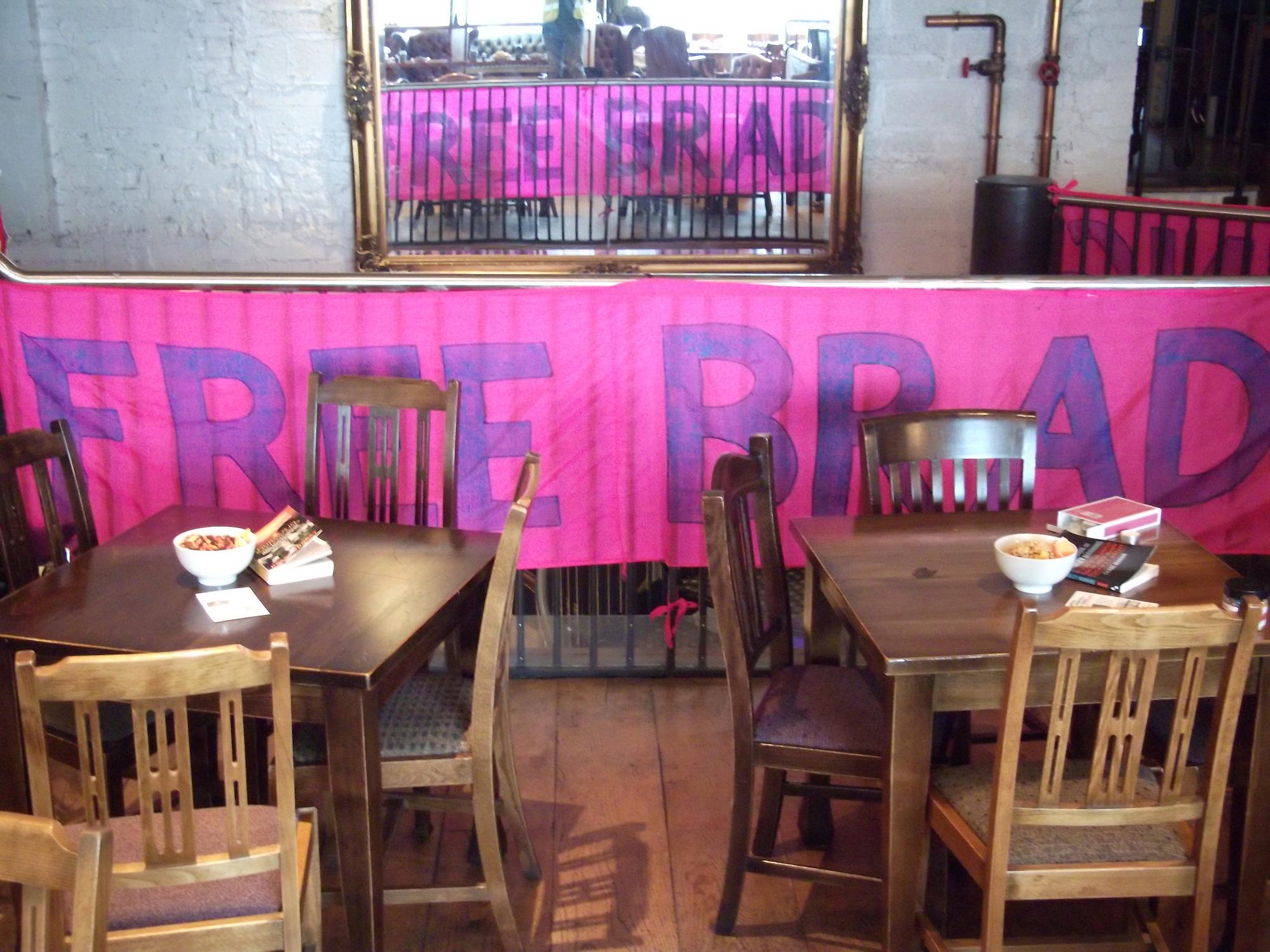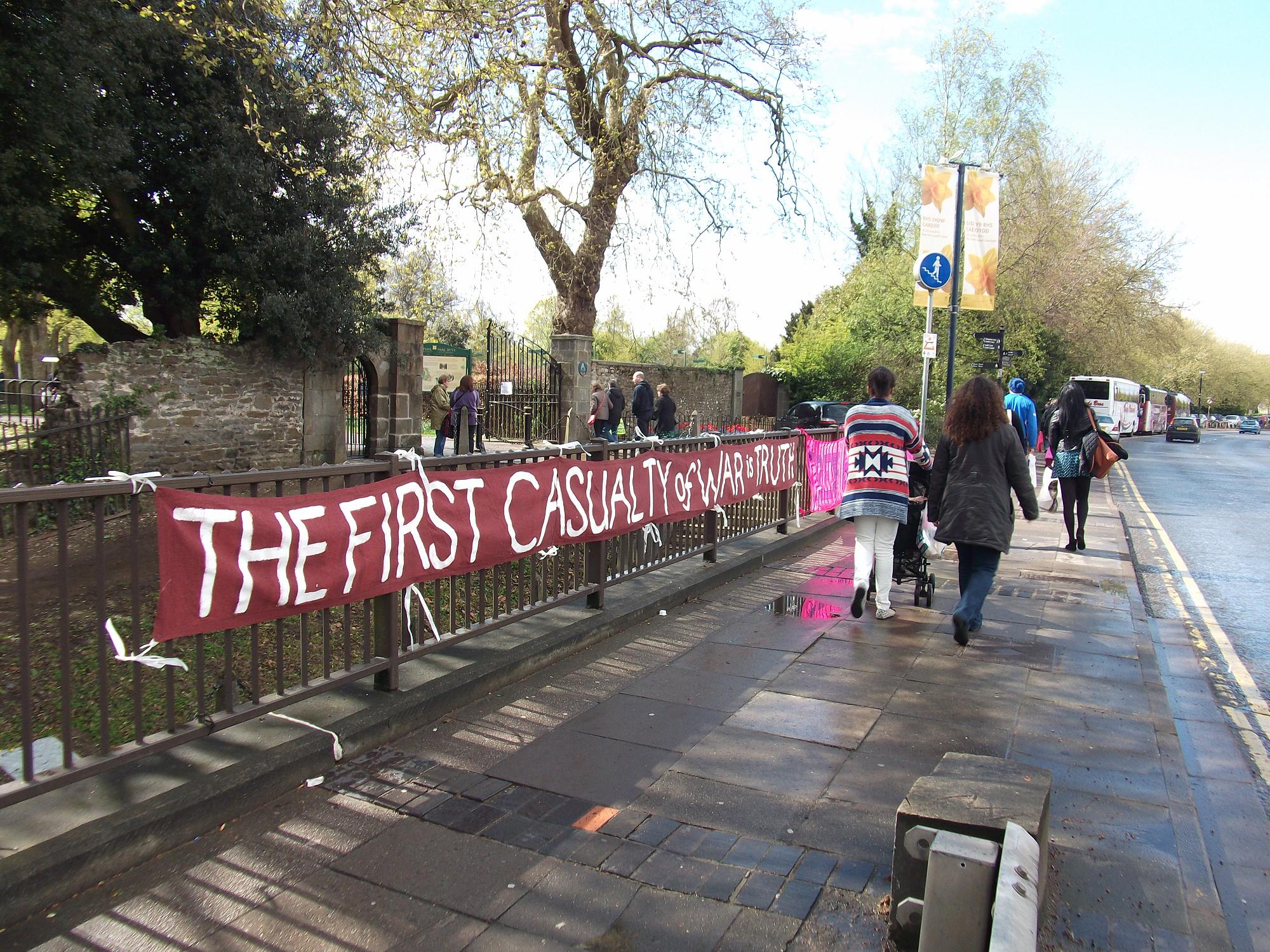 Sunday afternoon, we took advantage of a break in the otherwise persistent rain to do a multiple banner hang at the major road junction of North Road and Boulevard de Nantes at the pedestrian entrance to Bute Park, extra busy on account of the Royal Horticultural Show. Lots of flower show visitors asking 'Who's Bradley Manning?'