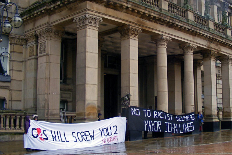 Large banners spanning the entrance of the Council House that read: “No To Racist Scumbag Mayor Lines” and “G4S will screw you 2” were the backdrop as passers-by stopped, despite the cold rain, to express their support.