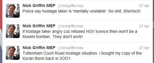 BNP Chairman Nick Griffin on Friday posted the following three messages on his Twitter account " Tottenham Court Road hostage situation. I bought my copy of the Koran there back in 2OO1."