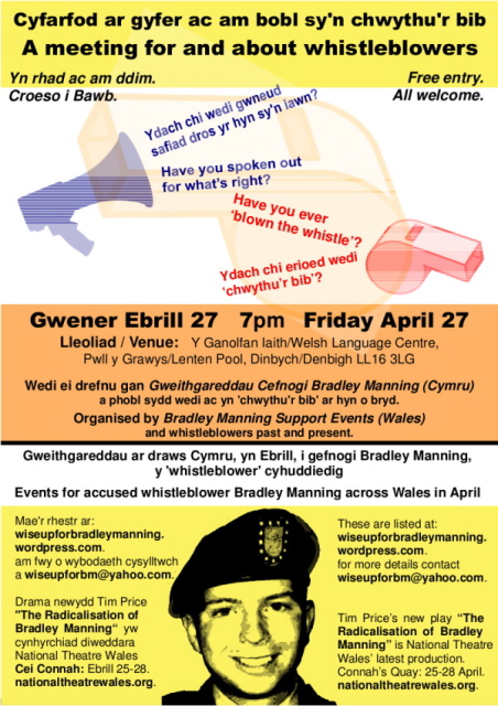Last Friday, a small meeting brought together whistleblowers past and present and their supporters in Denbigh as part of a three week series of events in Wales in solidarity with accused whistleblower Bradley Manning, who has now been detained by the US without trial for nearly two years, eleven months of which were endured under conditions of torture. Bradley faces life without parole or even the death penalty if eventually convicted at court martial of the charges against him. Meanwhile, President Obama, Commander-in-Chief of the military (which is carrying out the court martial), has already declared Bradley guilty in advance of any due legal process.