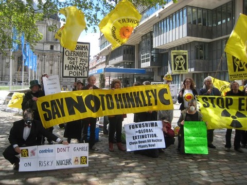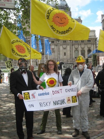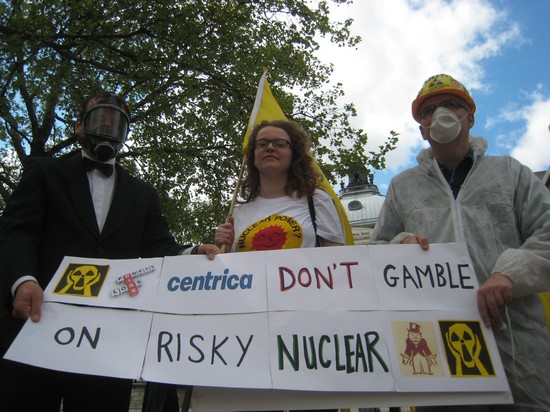 On Friday 11 May, Stop Hinkley, Kick Nuclear and friends held a two dozen-strong demo outside the AGM of Centrica (owner of British Gas) at the QE2 Centre in Westminster. Recent news reports suggest that Centrica may be getting cold feet about partnering with EDF Energy in its nuclear new build projects at Hinkley Point in Somerset and other sites in England. This protest aimed to reinforce the message to shareholders and investors that nuclear power is a risky gamble.