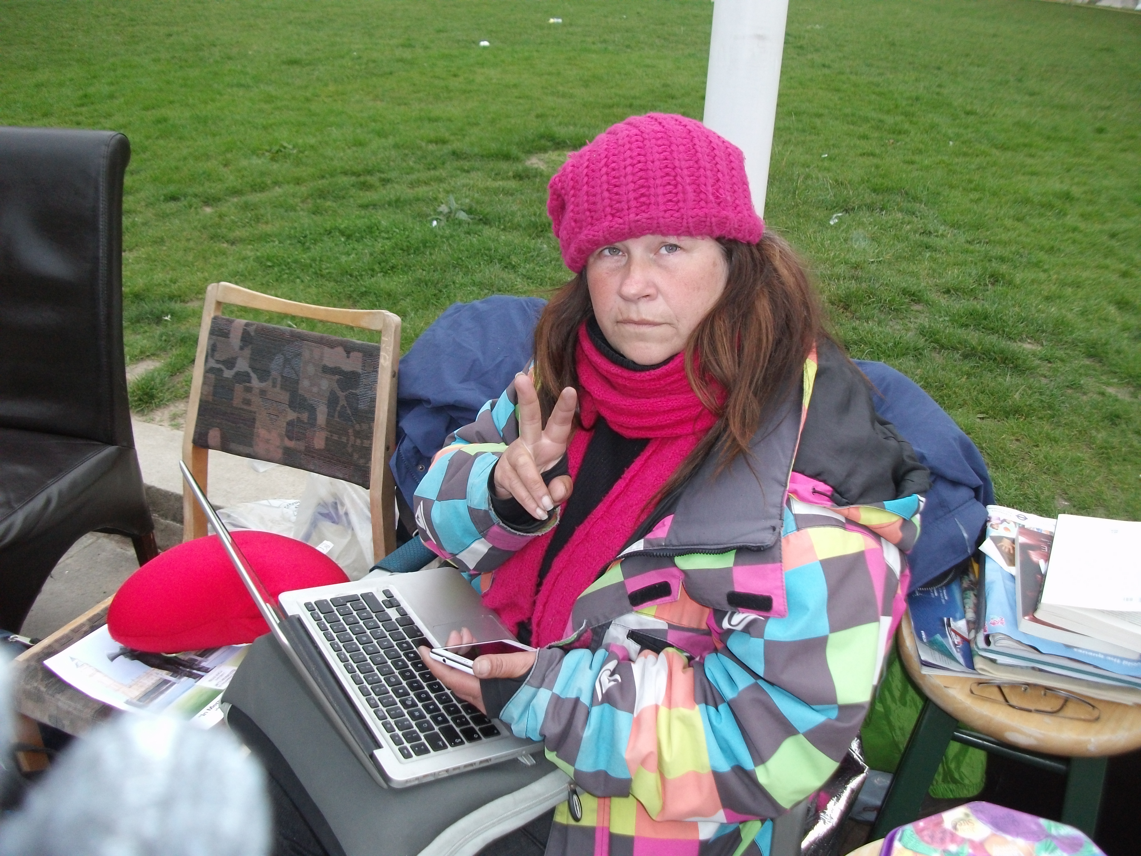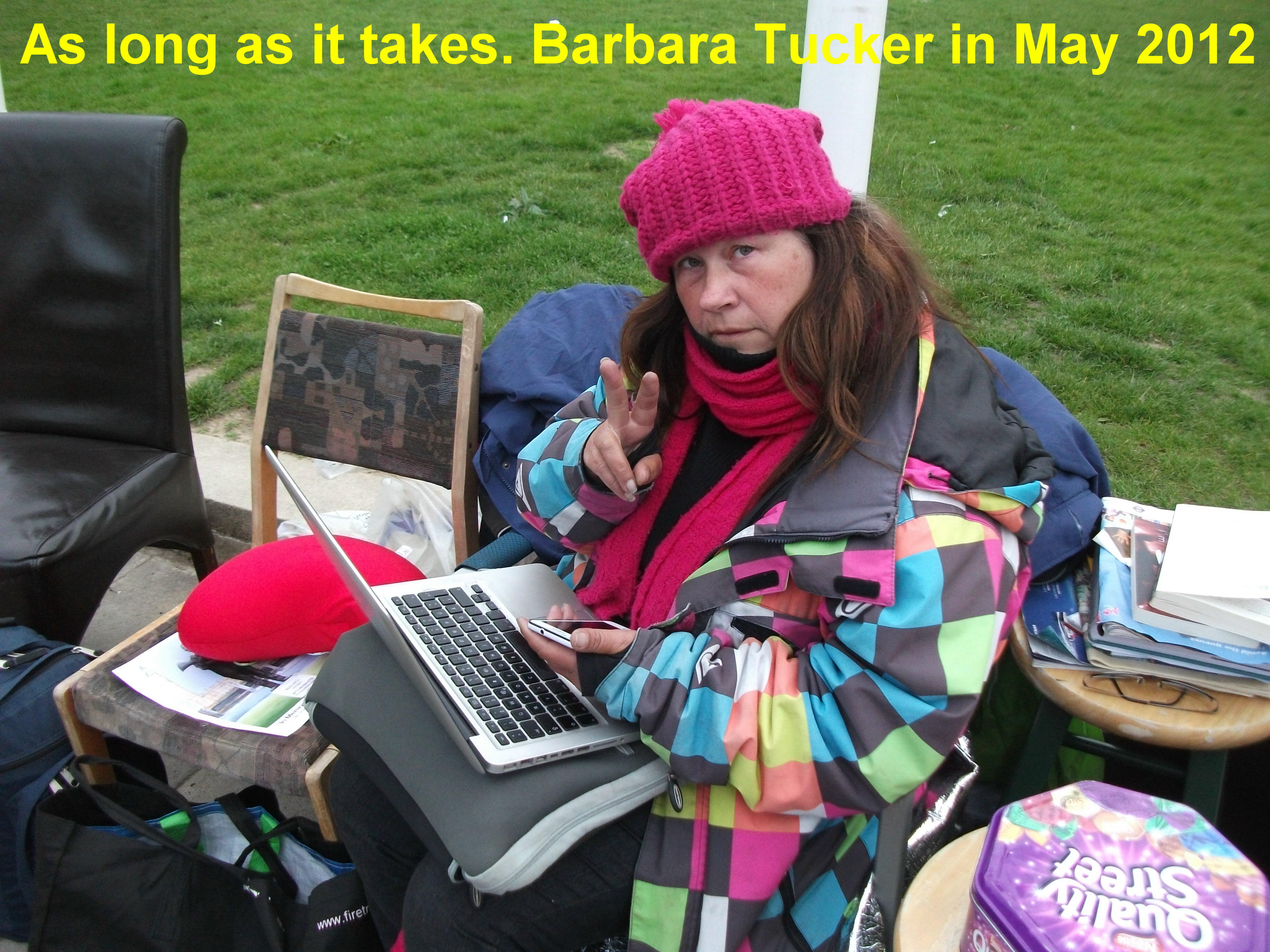 Barbara ‘Babs’ Tucker does not have a bed or even a tent or an umbrella or even blankets. She is suffering from exposure and has to sleep in a chair with constant nocturnal visits from thugs (official and unofficial). It’s incredible that a 5`4`` woman can do this vigil night after night on her own when even a 6` 4`` heavyweight boxer might have qualms about such an ordeal.