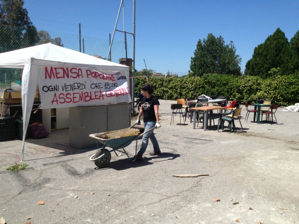 After the global day of action against austerity on May 15th – which in Italy was focused on Equitalia, the Italian state-owned tax department – the project decided to move on and occupy an abandoned sports centre, disused for the last 6 years despite the local residents’ requests to re-open it. The works at the “Nuova Periferia Polivalente” started straight away and culminated with a public assembly on June 3rd to discuss ideas and proposals for the project, which obviously include renovating the sports facilities, but also creating social spaces for adults and children, an employment-focused area to organise the local workers and an “Anti-Equitalia Advice Centre” for people in debt. The low-cost social canteen – one of key elements of the project since its origins – will come back with a newly built outdoor wooden oven.