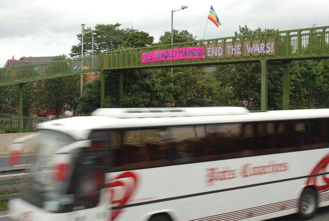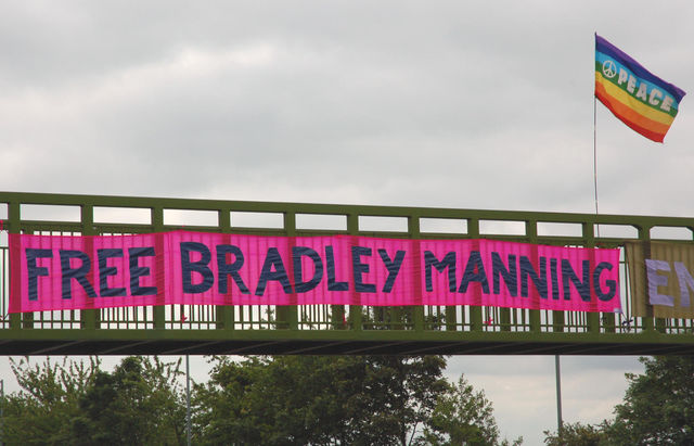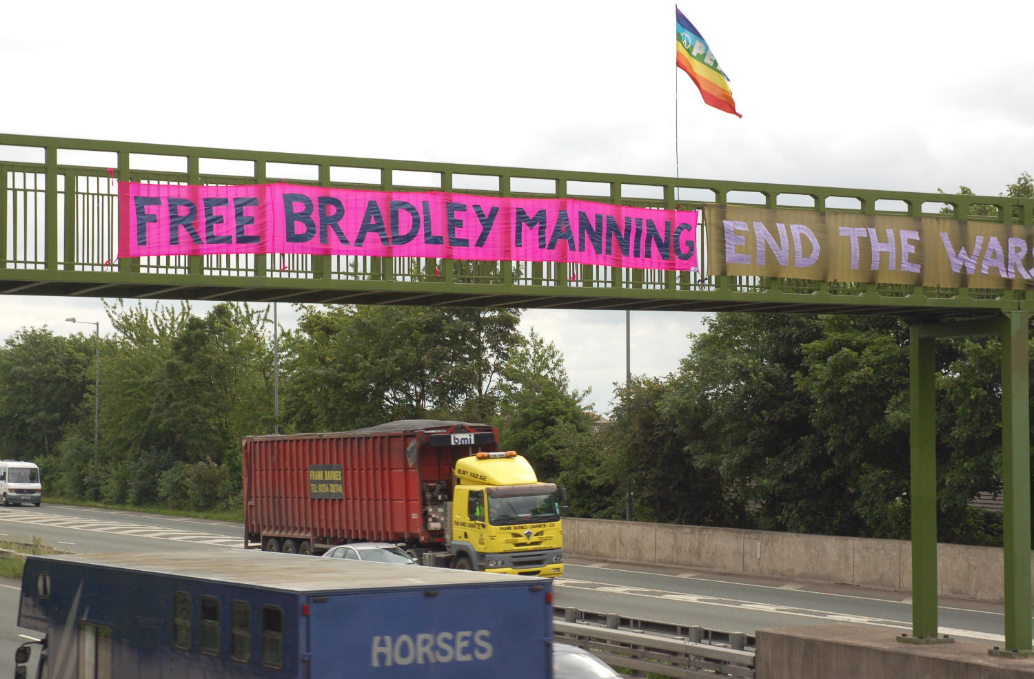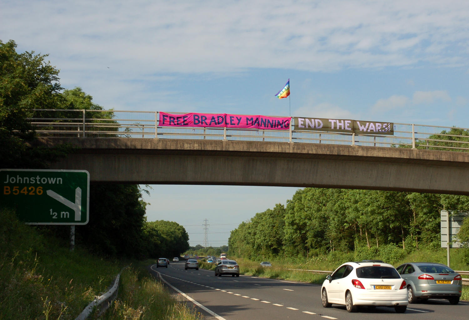 Bradley Manning back in court today. Banner drop in Wrexham, Wales
