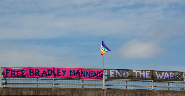 On Sunday, hundreds of supporters of the accused WikiLeaks whistle-blower marched in LGBT Pride Parades in New York, Chicago, and San Francisco. Supporters are preparing for another round of demonstrations to coincide with pre-trial hearings scheduled for July 16 to 20 at Fort Meade.