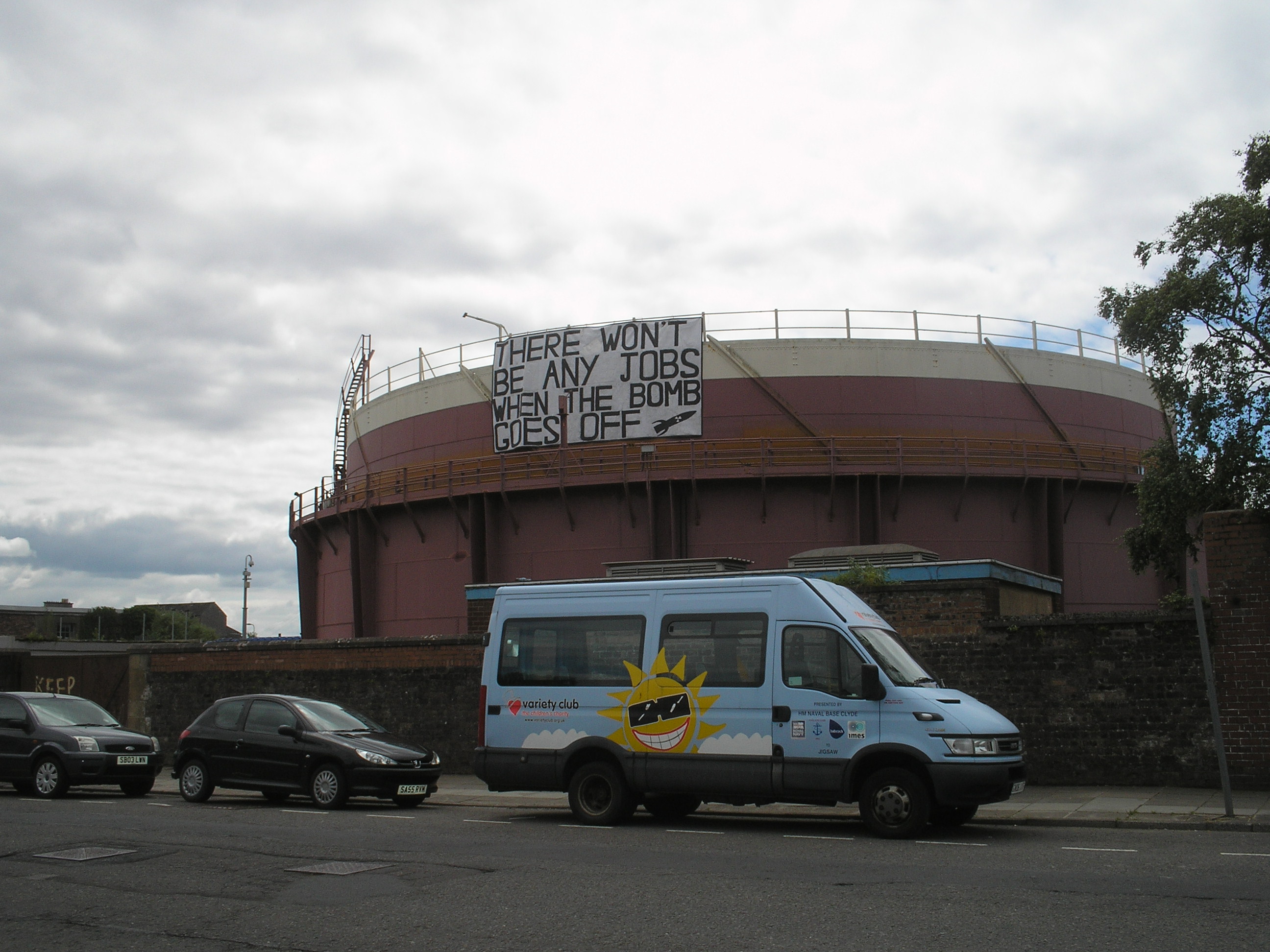 A banner drop was actioned from the gasometer in Helensburgh this week in response to the article ran in the Helensburgh Advertiser on June 21st welcoming the recent announcement of a £1.1 billion contract awarded to Rolls Royce for reactor work on Britain's nuclear submarine fleet. This announcement comes hot on the heels of news that a £350 million contract has been awarded to BAE Systems, Babcock Marine and Rolls-Royce in connection to the design stages of a Trident replacement. The disturbingly over simplified argument that jobs in the local area necessarily take priority over our international treaty and humanitarian obligations and indeed quite literal public safety issues, is an old tune, disappointingly also purported by our MSP Jackie Bailie.