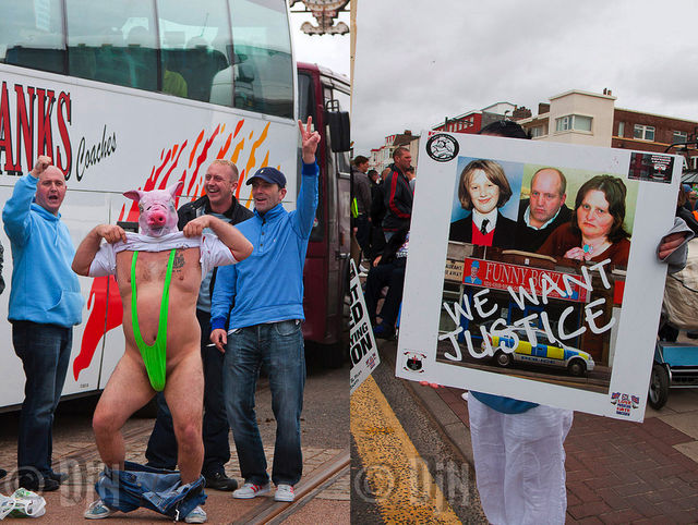 Bar stabbing rival football fans for the sheer hell of it, the likes of Jeff Marsh never took much interest in the welfare of young people, until the Fascists came across a case where a suspect happened to be Muslim, but if you want a true measure of the moral calibre of the Casuals / EDL, this photo shows how these "patriots" think it's appropriate to behave at an event highlighting the alleged abuse of a young girl (the photo was taken at the Casuals United protest in Blackpool on 28 May 2012) -