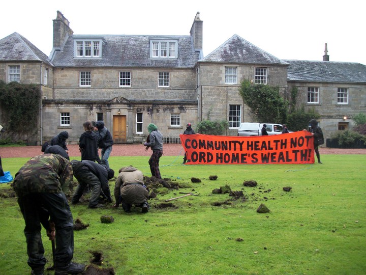 We said that the camp would target aristocrat landlords – in the past his garden has been invaded for frisbee games and he’s had car tyres let down during dinner parties – but this time his manicured lawn was dug up to bring the issues closer to home. As if the injustices in the Douglas Valley weren’t blatant enough with the corporate control, collusion between the mining company and local council, health and all the other impacts of opencast coal, most of the land in the valley is owned by a wealthy aristocrat. In fact, he’s a caricature of himself – he’s the son of former Tory prime minister Alec Home, went to Eton and Oxford University, is chairperson of Coutts Bank and of course, is a hereditary peer sitting in the house of lords. Lord Home is all about the money and will be getting millions for leasing his land to Scottish Coal for Mainshill and Glentaggart East.