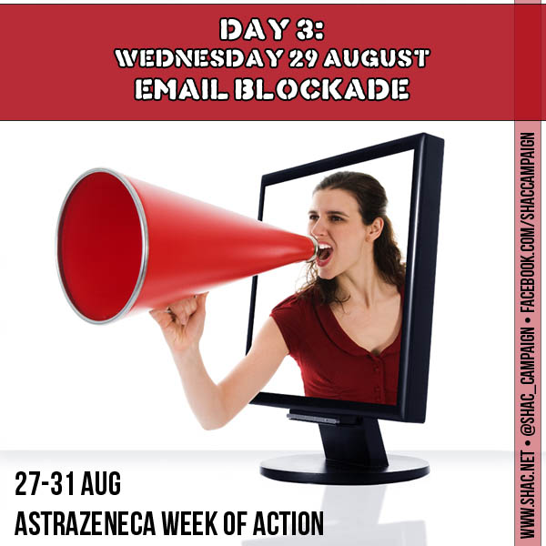 Today we're asking everyone to contact AstraZeneca anytime between 9am-5pm. But we'll also be revealing some surprise targets to email later in the day too. To find out who you'll need to keep checking for updates. These will be put up on the event page on our website, our Facebook and Twitter (see links below) pages and emailed out on our mailing list (